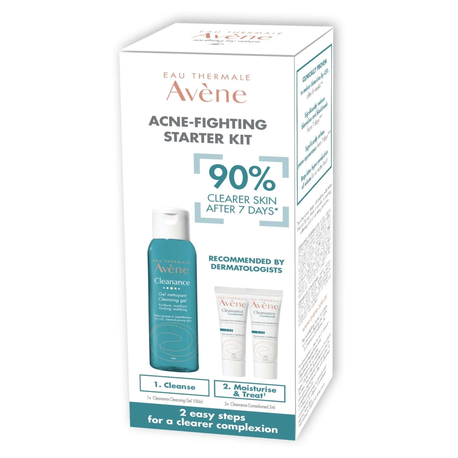 Avène Cleanance Acne fighting starter kit contains: Avène cleanance cleansing gel 100ml, 2 x Avène cleanance comedomed 5ml.