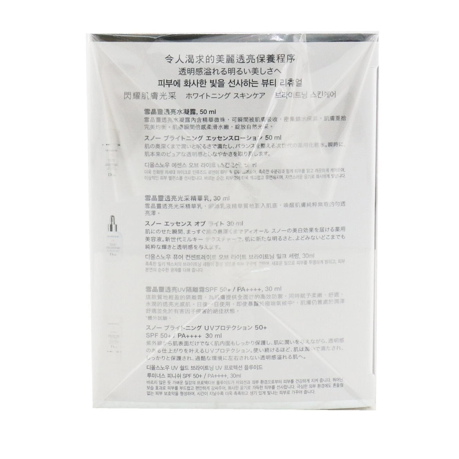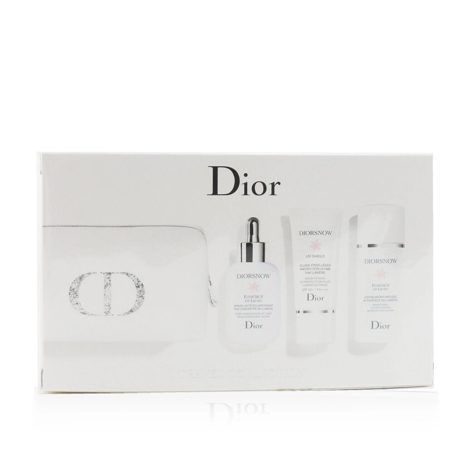 Diorsnow Brightening Collection: 1x Essence Of Light Pure Concentrate Of Light Brightening Milk Serum 30ml/1oz 1x Essence Of Light Brightening Light-Activating Micro-Infused Lotion 50ml/1.6oz 1x UV Shield Brightening UV Protection Fluid Luminous Finish SPF50 30ml/1oz 1x Pouch Ideal both for personal use & as a gift