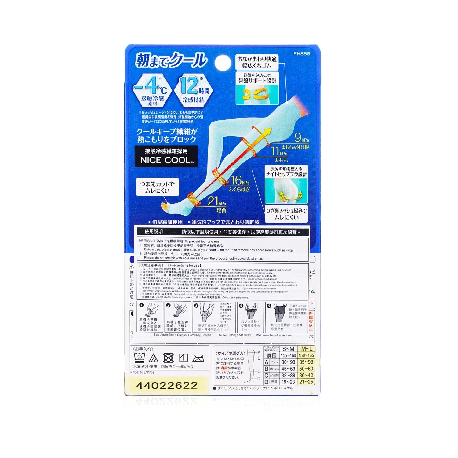 Japanese cooling compression stockings for sleep Designed to support the pelvis, shape the buttocks while you sleep & lift the slack part of the knee Features a four-stage pressure design: ankle 21 hPa, calf 16 hPa, thigh 11 hPa, foot 9 hPa Adopts NICECOOL fibers with cooling retention to prevent heat build-up Provides a cold contact feeling at -4 degrees that lasts for 12 hours With a mesh weave design on the knees Breathable, stretchy, comfortable & relaxing Made in Japan Suitable for home & sleep during summer Size details: S-M: Height 145-160cm; Butt 80-93cm; Thigh 45-53cm; Calf 32-38cm; Ankle 19-23cm M-L: Height 150-165cm; Butt 85-98cm; Thigh 50-60cm; Calf 36-42cm; Ankle 21-25cm